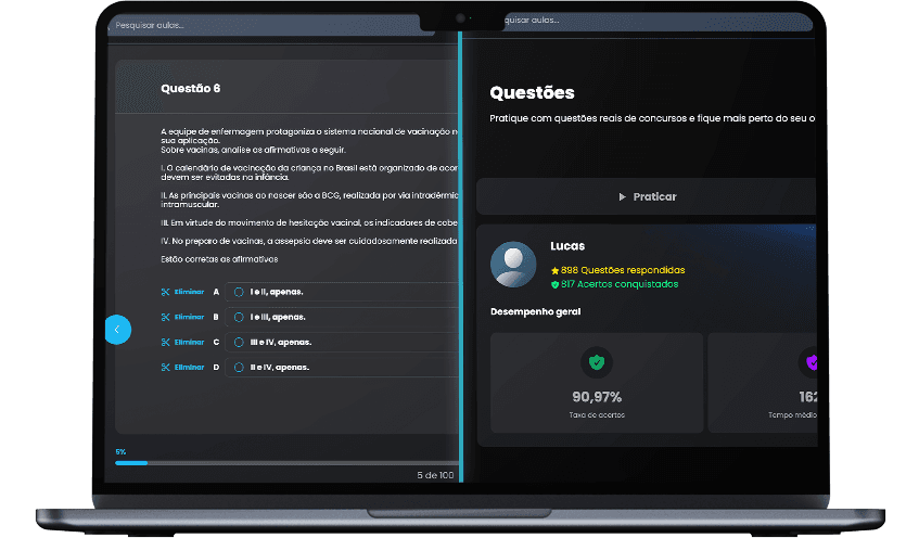 Resolva questões reais de concurso direto na plataforma e monitore sua evolução com dados concretos: taxa de acertos, tempo médio e muito mais.